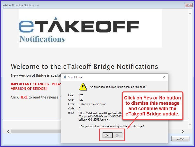 Bridge Update Error Mary Spero Oct 16, 2025 12 When you open eTakeoff Bridge and receive the following window: Click on the Yes or No button to dismiss the message and continue with the Bridge update.
